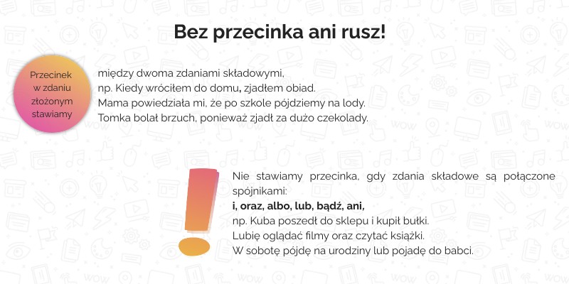 między dwoma zdaniami składowymi,np. Kiedy wróciłem do domu, zjadłem obiad. Mama powiedziała mi, że po szkole pójdziemy na lody. Tomka bolał brzuch, ponieważ zjadł za dużo czekolady.