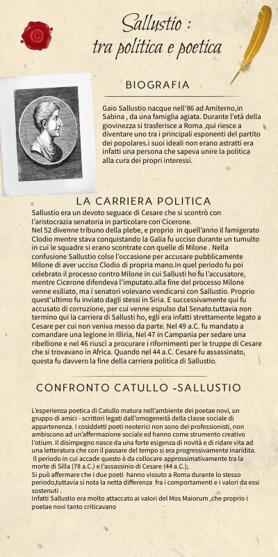 Gaio Sallustio nacque nell’86 ad Amiterno,in Sabina , da una famiglia agiata. Durante l'età della giovinezza si trasferisce a Roma ,qui riesce a diventare uno tra i principali esponenti del partito dei popolares.I suoi ideali non erano astratti era infatti una persona che sapeva unire la politica alla cura dei propri interessi.