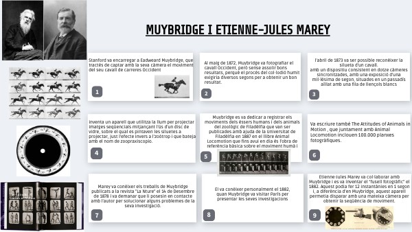 Etienne-Jules Marey va col·laborar amb Muybridge i es va inventar el “fusell fotogràfic” el 1882. Aquest podia fer 12 instantànies en 1 segon i, a diferència d’en Muybridge, aquest aparell permetia disparar amb una mateixa càmera per obtenir la seqüència de moviment.