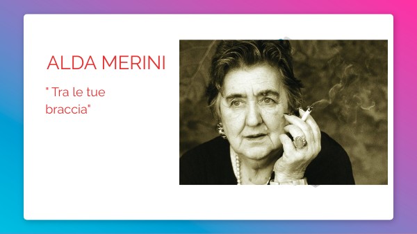 Alda Merini è stata una delle più grandi poetesse italiane del XX secolo. Nasce a Milano il 21 marzo 1931. e vive durante il periodo della seconda guerra mondiale. All’età di 15 anni Alda torna a casa mostrando al padre la sua prima poesia ma il padre la strappa dicendole "La poesia non dà il pane". Nel 1947 cominciano i suoi primi disturbi psicologici e 3 anni dopo ci furono le sue prime pubblicazioni. Nel 1964 viene ricoverata in un ospedale psichiatrico e ci rimane fino al 1972 e nel 1979 riprende a scrivere. Nel 2009 muore per un tumore osseo