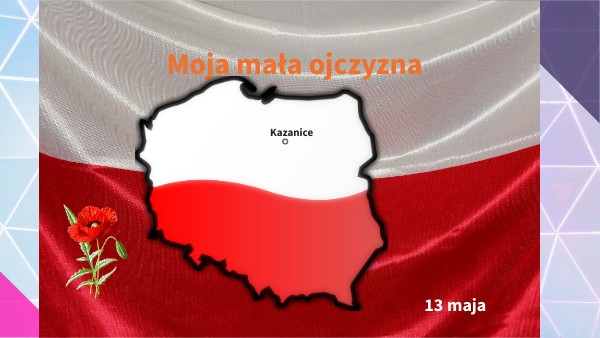 "Moja mała ojczyzna"Joanna Białobrzeska Jest na mapie mała kropka, ja tu mieszkam, tu mnie spotkasz. Jest ciekawie i wesoło w moim świecie naokoło. Na podwórku trzy kałuże, położyły się przy murze, trzepak bardzo dziś kaprysi - duży dywan na nim wisi. Słońce z cieniem gra tu w berka, pan kominiarz z dachu zerka, teraz chyba każdy przyzna, że jest piękna ma Ojczyzna!