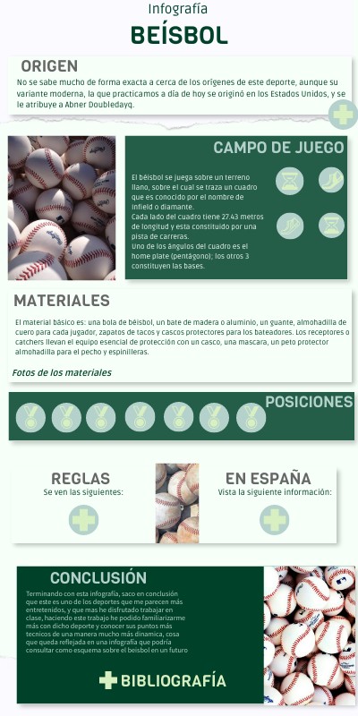 Terminando con esta infografía, saco en conclusión que este es uno de los deportes que me parecen más entretenidos, y que mas he disfrutado trabajar en clase, haciendo este trabajo he podido familiarizarme más con dicho deporte y conocer sus puntos más tecnicos de una manera mucho más dinamica, cosa que queda reflejada en una infografía que podría consultar como esquema sobre el beisbol en un futuro