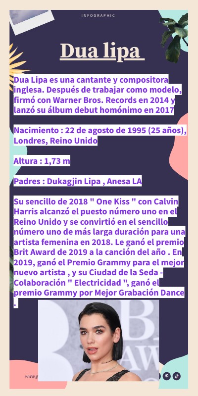 Dua Lipa es una cantante y compositora inglesa. Después de trabajar como modelo, firmó con Warner Bros. Records en 2014 y lanzó su álbum debut homónimo en 2017 Nacimiento : 22 de agosto de 1995 (25 años), Londres, Reino Unido Altura : 1,73 m Padres : Dukagjin Lipa , Anesa LA Su sencillo de 2018 " One Kiss " con Calvin Harris alcanzó el puesto número uno en el Reino Unido y se convirtió en el sencillo número uno de más larga duración para una artista femenina en 2018. Le ganó el premio Brit Award de 2019 a la canción del año . En 2019, ganó el Premio Grammy para el mejor nuevo artista , y su Ciudad de la Seda -Colaboración " Electricidad ", ganó el premio Grammy por Mejor Grabación Dance .