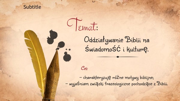 - charakteryzuję różne motywy biblijne;- wyjaśniam związki frazeologiczne pochodzące z Biblii.
