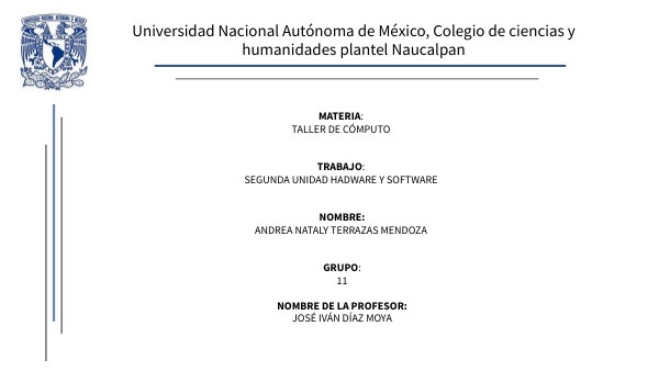 Materia: Taller de Cómputo Trabajo: segunda unidad hadware y software NOMBRE: Andrea Nataly Terrazas Mendoza Grupo: 11 NOMBRE DE LA PROFESOR: José Iván Díaz Moya