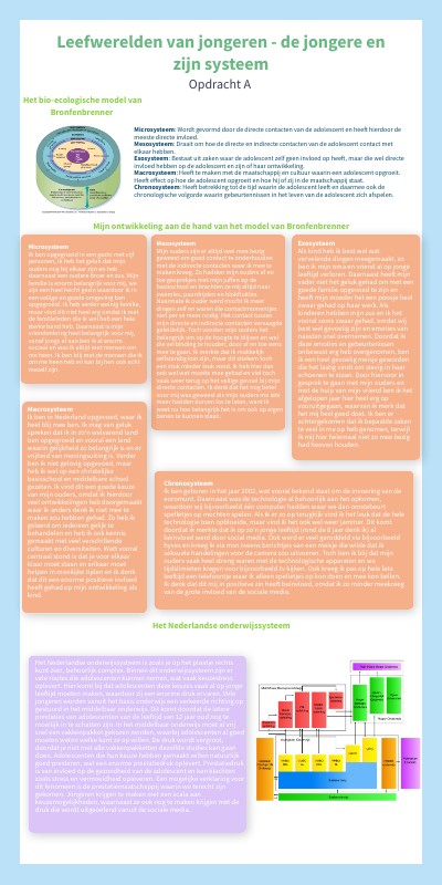 Macrosysteem Ik ben in Nederland opgevoed, waar ik heel blij mee ben. Ik mag van geluk spreken dat ik in zo'n welvarend land ben opgegroeid en vooral een land waarin gelijkheid zo belangrijk is en er vrijheid van meningsuiting is. Verder ben ik niet gelovig opgevoed, maar heb ik wel op een christelijke basisschool en middelbare school gezeten. Ik vind dit een goede keuze van mijn ouders, omdat ik hierdoor veel ontwikkelingen heb doorgemaakt waar ik anders denk ik niet mee te maken zou hebben gehad. Zo heb ik geleerd om iedereen gelijk te behandelen en heb ik ook kennis gemaakt met veel verschillende culturen en diversiteiten. Wat vooral centraal stond is dat je voor elkaar klaar moet staan en erlkaar moet helpen in moeilijke tijden en ik denk dat dit een enorme positieve invloed heeft gehad op mijn ontwikkeling als kind.