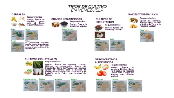 Suelos, Época de siembra, Lluvias, Método de propagación, Época de trasplante, Clima (el Tabaco no requiere época de siembra pero si método de propagación y época de trasplante, y el Algodón es el único que requiere de clima).
