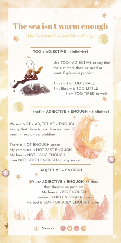 Use TOO+ ADJECTIVE to say that there is more than we need or want. Explains a problem.This shirt is TOO SMALL This library is TOO LITTLE I am TOO TIRED to walk.