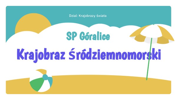 Tyluł: KRAJOBRAZ ŚRÓDZIEMNOMORSKIKategorie (główne odnogi) 1) POŁOŻENIE (krainy geograficzne lub kontynenty) 2) KLIMAT (strefa klimatyczna, pory roku, temperatury i opady) 3) ROŚLINNOŚĆ 4) ZWIERZĘTA 5) LUDZIE (zajęcia, domy)