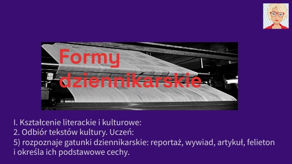 I. Kształcenie literackie i kulturowe: 2. Odbiór tekstów kultury. Uczeń: 5) rozpoznaje gatunki dziennikarskie: reportaż, wywiad, artykuł, felieton i określa ich podstawowe cechy.