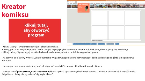 - Kliknij „sceny” i wybierz scenerię (tło) okienka komiksu. -Kliknij „postacie” i wybierz postać (zwróć uwagę, że po jej wyborze możesz zmienić kolor włosów, ubioru, pozę, wyraz twarzy). - Kliknij „teksty” i przeciągnij na okienko komiksu chmurkę, w której umieścisz wypowiedź postaci. - Na samym dole strony wybierz „układ” i zmienić wygląd swojego okienka komiksowego, dodając do niego na górze ramkę na słowa narratora. - Na samym dole strony możesz wybrać „dodaj/usuń komórki” i zmienić układ komiksu na 6 okienek. - Możesz zrobić print screen, czyli rzut ekranu (klawisz prt sc) opracowanych okienek komiksu i wkleić je do Worda lub w treść maila. Dzięki temu nie będzie wyświetlać się napis "demo".