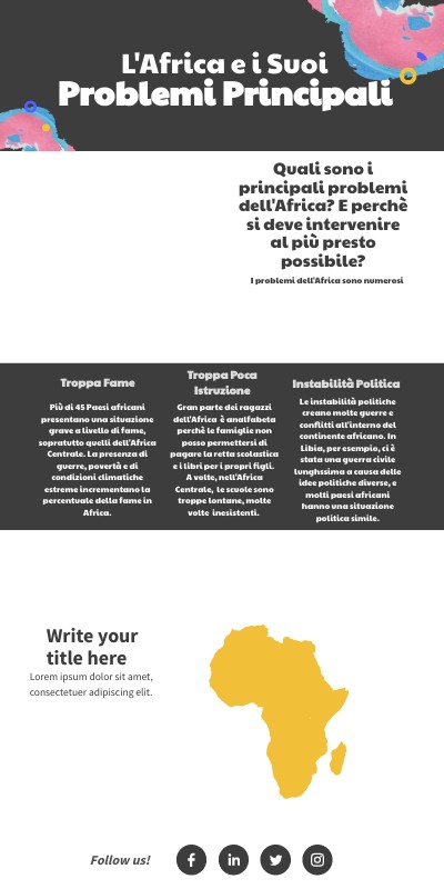 Le instabilità politiche creano molte guerre e conflitti all'interno del continente africano. In Libia, per esempio, ci è stata una guerra civile lunghssima a causa delle idee politiche diverse, e molti paesi africani hanno una situazione politica simile.