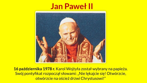 16 października 1978 r. Karol Wojtyła został wybrany na papieża. Swój pontyfikat rozpoczął słowami: „Nie lękajcie się! Otwórzcie, otwórzcie na oścież drzwi Chrystusowi!”
