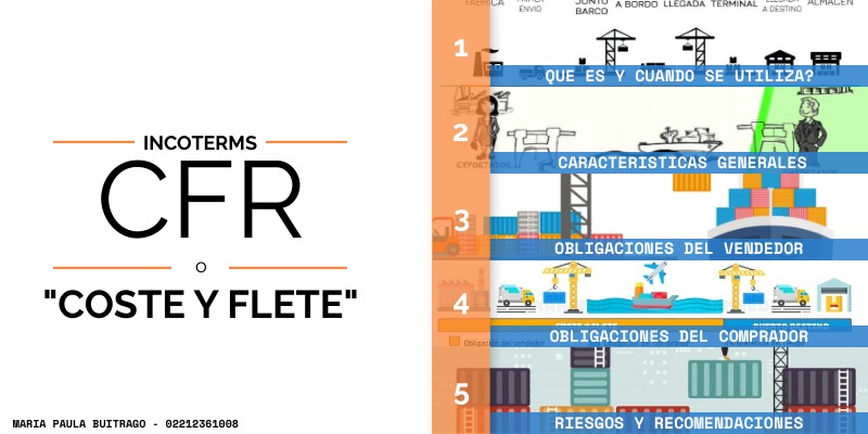 El termino CFR se refiere a "Coste y Flete", en donde las operaciones de compraventa regidas por este termino, el vendedor entrega la mercancia a bordo del buque, asi mismo, debe contratar y pagar tanto los costos como el flete para llevar la mercancia al puerto de destino. La entrega se produce en el momento en que la mercancía es liberada del control directo del vendedor, y no cuando la mercancía llegue al destino. Se utiliza solo en transporte marítimo o fluvial.
