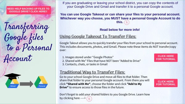 If you are graduating or leaving your school district, you can copy the contents of your Google Drive and Gmail and transfer it to a personal Google account. You can use Google Takeout or can share your files to your personal account. Whichever way you choose, you MUST have a personal Google Account to do this. Read below for more info!