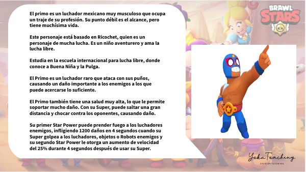 El primo es un luchador mexicano muy musculoso que ocupa un traje de su profesión. Su punto débil es el alcance, pero tiene muchísima vida. Este personaje está basado en Ricochet, quien es un personaje de mucha lucha. Es un niño aventurero y ama la lucha libre. Estudia en la escuela internacional para lucha libre, donde conoce a Buena Niña y la Pulga. El Primo es un luchador raro que ataca con sus puños, causando un daño importante a los enemigos a los que puede acercarse lo suficiente. El Primo también tiene una salud muy alta, lo que le permite soportar mucho daño. Con su Super, puede saltar una gran distancia y chocar contra los oponentes, causando daño. Su primer Star Power puede prender fuego a los luchadores enemigos, infligiendo 1200 daños en 4 segundos cuando su Super golpea a los luchadores, objetos o Robots enemigos y su segundo Star Power le otorga un aumento de velocidad del 25% durante 4 segundos después de usar su Super.