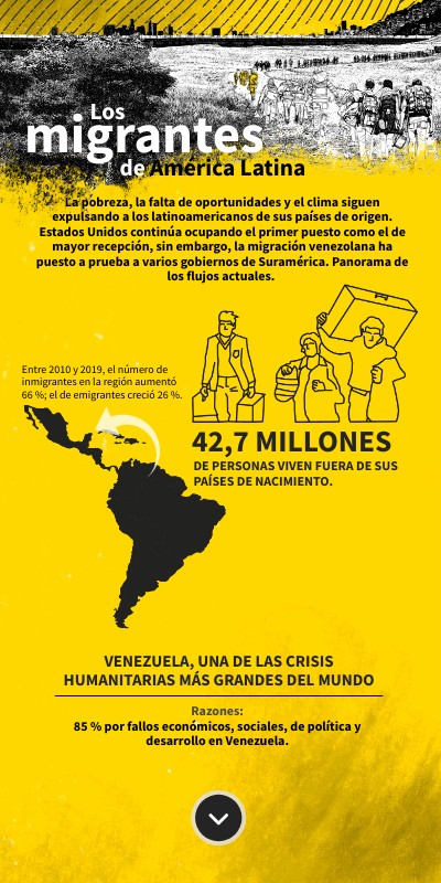 La pobreza, la falta de oportunidades y el clima siguen expulsando a los latinoamericanos de sus países de origen. Estados Unidos continúa ocupando el primer puesto como el de mayor recepción, sin embargo, la migración venezolana ha puesto a prueba a varios gobiernos de Suramérica. Panorama de los flujos actuales.