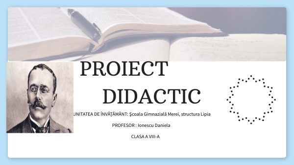 PROIECT DIDACTIC UNITATEA DE ÎNVĂŢĂMÂNT: Şcoala Gimnazială Merei, structura Lipia CLASA: a VIII-a PROFESOR : Ionescu Daniela ARIA CURRICULARĂ: Limbă şi comunicare DISCIPLINA: Limba şi literatura română UNITATEA DE ÎNVĂŢARE: Genul dramatic TEMA LECŢIEI: Comedia- O scrisoare pierdută de Ion Luca Caragiale TIPUL LECŢIEI: de recapitulare şi sistematizare COMPETENŢE:Competenţe generale:1. Receptarea mesajului oral în diferite situaţii de comunicare;2. Utilizarea corectă şi adecvată a limbii române în producerea de mesaje orale ṣi scrise în situaţii de comunicare monologată şi dialogată;3. Receptarea mesajului scris, din texte literare şi nonliterare, în scopuri diverse.Competenţe specifice:1.1. utilizarea adecvată a achiziţiilor lingvistice în receptarea diverselor texte;1.2. identificarea elementelor specifice din structura unor texte studiate;1.5. utilizarea corectă şi adecvată a formelor exprimării orale şi scrise în diverse situaţii;2.4. analiza componentelor structurale şi expresive ale textului şi discutarea rolului acestora;3.2. identificarea elementelor dintr-un text care confirmă sau infirmă o opinie privitoare la textul respectiv;3.3. argumentarea unui punct de vedere despre text.