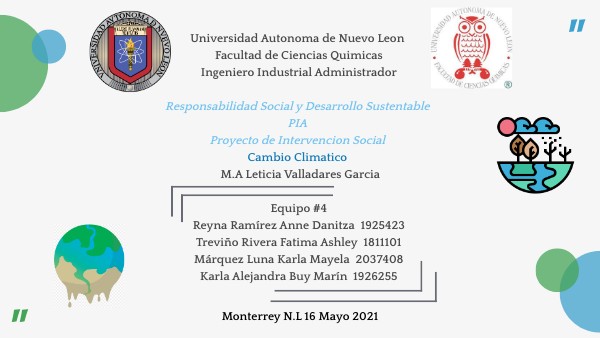 Universidad Autonoma de Nuevo Leon Facultad de Ciencias Quimicas Ingeniero Industrial Administrador Responsabilidad Social y Desarrollo Sustentable PIA Proyecto de Intervencion Social Cambio Climatico M.A Leticia Valladares Garcia Equipo #4 Reyna Ramírez Anne Danitza 1925423 Treviño Rivera Fatima Ashley 1811101Márquez Luna Karla Mayela 2037408Karla Alejandra Buy Marín 1926255