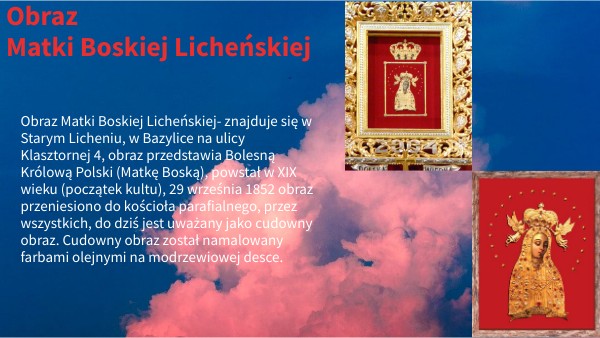 Obraz Matki Boskiej Licheńskiej- znajduje się w Starym Licheniu, w Bazylice na ulicy Klasztornej 4, obraz przedstawia Bolesną Królową Polski (Matkę Boską), powstał w XIX wieku (początek kultu), 29 września 1852 obraz przeniesiono do kościoła parafialnego, przez wszystkich, do dziś jest uważany jako cudowny obraz. Cudowny obraz został namalowany farbami olejnymi na modrzewiowej desce.