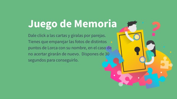 Dale click a las cartas y giralas por parejas. Tienes que emparejar las fotos de distintos puntos de Lorca con su nombre, en el caso de no acertar girarán de nuevo. Dispones de 30 segundos para conseguirlo.