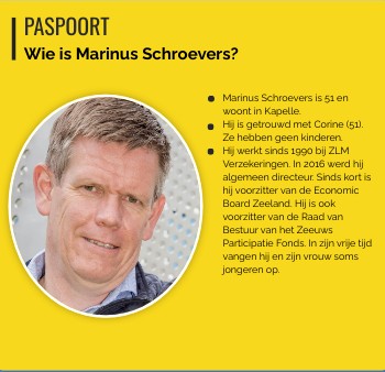 Marinus Schroevers is 51 en woont in Kapelle. Hij is getrouwd met Corine (51). Ze hebben geen kinderen. Hij werkt sinds 1990 bij ZLM Verzekeringen. In 2016 werd hij algemeen directeur. Sinds kort is hij voorzitter van de Economic Board Zeeland. Hij is ook voorzitter van de Raad van Bestuur van het Zeeuws Participatie Fonds. In zijn vrije tijd vangen hij en zijn vrouw soms jongeren op.