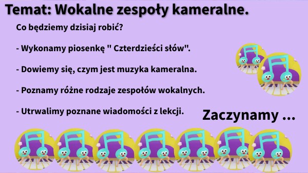 Co będziemy dzisiaj robić? - Wykonamy piosenkę " Czterdzieści słów". - Dowiemy się, czym jest muzyka kameralna. - Poznamy różne rodzaje zespołów wokalnych. - Utrwalimy poznane wiadomości z lekcji.
