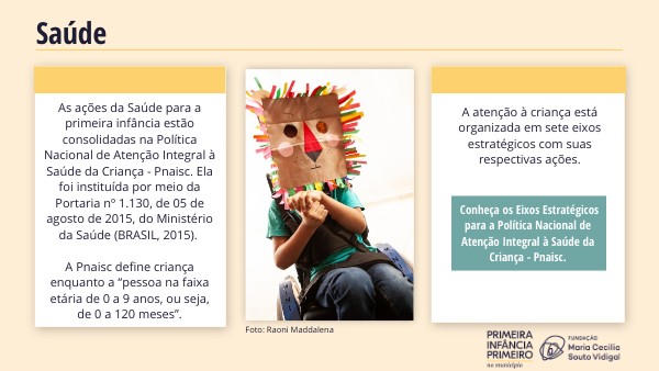 As ações da Saúde para a primeira infância estão consolidadas na Política Nacional de Atenção Integral à Saúde da Criança - Pnaisc. Ela foi instituída por meio da Portaria nº 1.130, de 05 de agosto de 2015, do Ministério da Saúde (BRASIL, 2015). A Pnaisc define criança enquanto a “pessoa na faixa etária de 0 a 9 anos, ou seja, de 0 a 120 meses”.