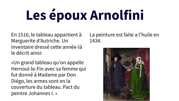 «Un grand tableau qu'on appelle Hernoul-le-Fin avec sa femme qui fut donné à Madame par Don Diégo, les armes sont en la couverture du tableau. Pact du peintre Johannes I. »