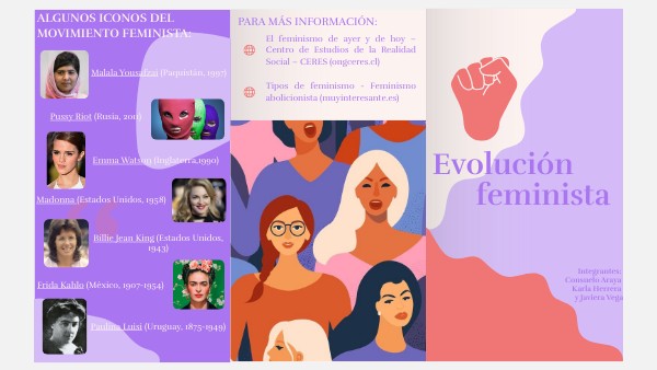 El feminismo es una ideología y movimiento social que busca la equidad entre hombres y mujeres, en aspectos sociales, culturales y económicos entre ambos sexos. Como también de alcanzar la justicia y la libertad total, para que podamos decidir sobre nosotras mismas. Este movimiento es muy amplio, tiene 300 años de historia, múltiples autores, y cuatro "olas" o épocas, a grandes rasgos. Actualmente, el debate gira en torno a dos posturas: el feminismo liberal y el feminismo radical.