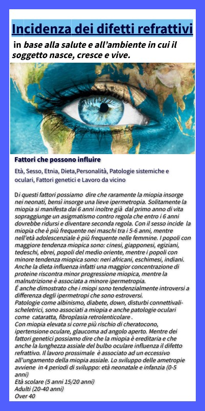 Di questi fattori possiamo dire che raramente la miopia insorge nei neonati, bensì insorge una lieve ipermetropia. Solitamente la miopia si manifesta dai 6 anni inoltre già dal primo anno di vita sopraggiunge un asigmatismo contro regola che entro i 6 anni dovrebbe ridursi e diventare seconda regola. Con il sesso incide la miopia che è più frequente nei maschi tra i 5-6 anni, mentre nell'età adolescenziale è più frequente nelle femmine. I popoli con maggiore tendenza miopica sono: cinesi, giapponesi, egiziani, tedeschi, ebrei, popoli del medio oriente, mentre i popoli con minore tendenza miopica sono: neri africani, eschimesi, indiani. Anche la dieta influenza infatti una maggior concentrazione di proteine riscontra minor progressione miopica, mentre la malnutrizione è associata a minore ipermetropia. É anche dimostrato che i miopi sono tendenzialmente introversi a differenza degli ipermetropi che sono estroversi. Patologie come albinismo, diabete, down, disturbi connettivali-scheletrici, sono associati a miopia e anche patologie oculari come cataratta, fibroplasia retrolenticolare . Con miopia elevata si corre più rischio di cheratocono, ipertensione oculare, glaucoma ad angolo aperto. Mentre dei fattori genetici possiamo dire che la miopia è ereditaria e che anche la lunghezza assiale del bulbo oculare influenza il difetto refrattivo. Il lavoro prossimale è associato ad un eccessivo all'ungamento della miopia assiale. Lo sviluppo delle ametropie avviene in 4 periodi di sviluppo: età neonatale e infanzia (0-5 anni) Età scolare (5 anni 15/20 anni) Adulti (20-40 anni) Over 40