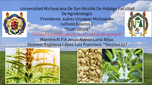 Universidad Michoacana De San Nicolás De Hidalgo Facultad De Agrobiología Presidente Juárez Uruapan Michoacán cultivos basicos II “Fruticultura” "Cosecha y poscosecha en el cultivo de ajonjoli" Maestro:M.P.A Jesús Alonso Luna Béjar. Alumno: Espinosa López Luis Francisco. “Sección 01”