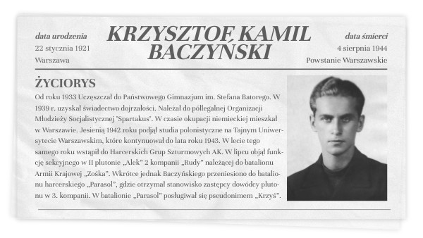 Źródła materiałów wykorzystanych w gazetce https://culture.pl/pl/tworca/krzysztof-kamil-baczynski https://poezja.org/wz/Baczyński_Krzysztof_Kamil/ https://www.piastow.pl/kalendarium/2015/tworczosc-poety-krzysztofa-kamila-baczynskiego https://ciekawostkihistoryczne.pl/2019/07/17/krzysztof-kamil-baczynski-i-barbara-drapczynska-najtragiczniejsza-historia-milosna-powstania-warszawskiego/ http://ekartkazwarszawy.pl/kartka/smierc-poety/ https://www.1944.pl/powstancze-biogramy/krzysztof-baczynski,805.html https://culture.pl/pl/tworca/krzysztof-kamil-baczynski https://www.1944.pl/artykul/barbara-i-krzysztof-baczynscy.-tragiczna-histor,5076.html https://ornatowski.com/genealogia/wspomnienia/genealogiczny-mit/ https://www.piastow.pl/kalendarium/2015/tworczosc-poety-krzysztofa-kamila-baczynskiego