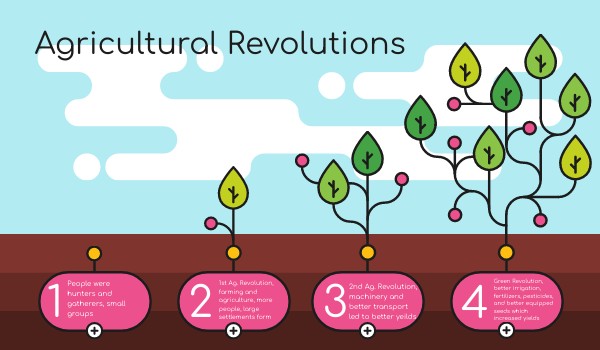 1st Ag. Revolution, farming and agriculture, more people, large settlements form