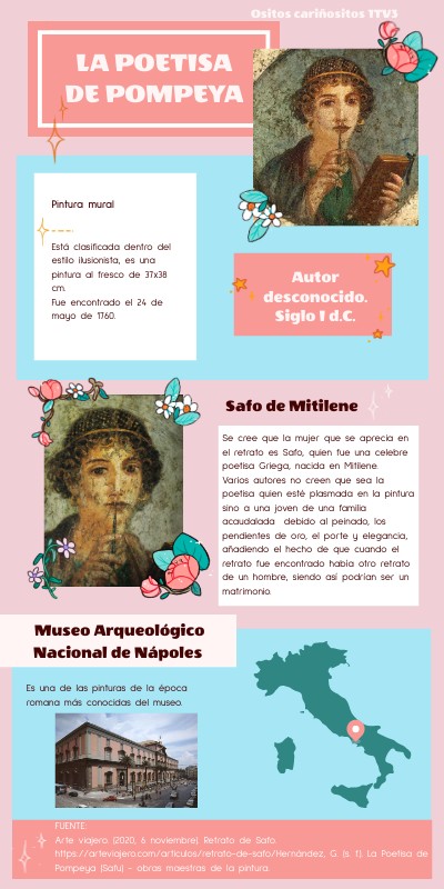 FUENTE:Arte viajero. (2020, 6 noviembre). Retrato de Safo. https://arteviajero.com/articulos/retrato-de-safo/Hernández, G. (s. f.). La Poetisa de Pompeya (Safu) - obras maestras de la pintura.