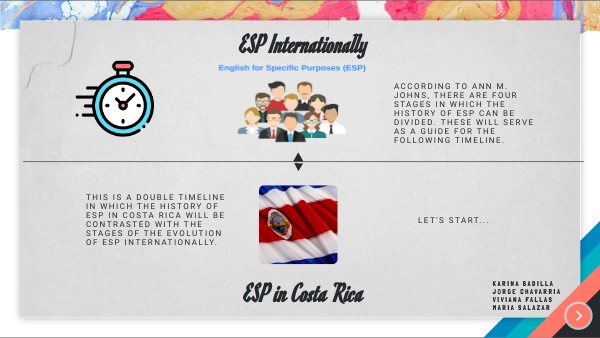 This is a double timeline in which the history of esp in costa rica will be contRasted with the stages of the evolution of esp internationally.
