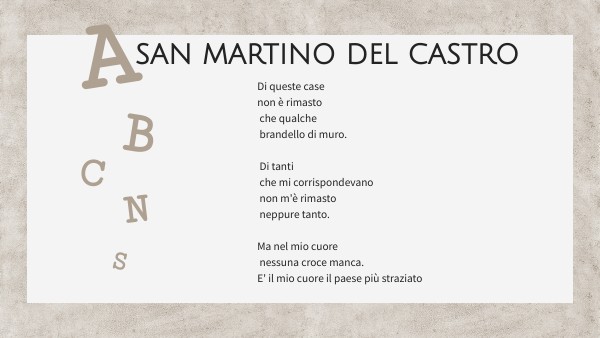 Di queste case non è rimasto che qualche brandello di muro. Di tanti che mi corrispondevano non m'è rimasto neppure tanto. Ma nel mio cuore nessuna croce manca. E' il mio cuore il paese più straziato