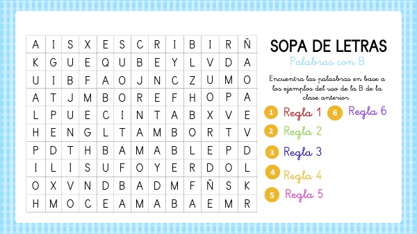 Encuentra las palasbras en base a los ejemplos del uso de la B de la clase anterior