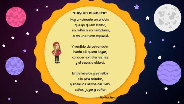 Hay un planeta en el cielo que yo quiero visitar, en avión o en aeroplano, o en una nave espacial. Y vestido de astronauta hasta allí quiero llegar, conocer extraterrestres y el espacio sideral. Entre luceros y estrellas a la luna saludar, y entre los astros del cielo, saltar, jugar y soñar.