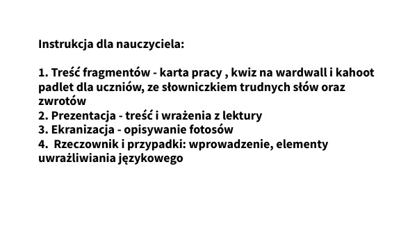 Instrukcja dla nauczyciela: 1. Treść fragmentów - karta pracy , kwiz na wardwall i kahoot padlet dla uczniów, ze słowniczkiem trudnych słów oraz zwrotów 2. Prezentacja - treść i wrażenia z lektury 3. Ekranizacja - opisywanie fotosów 4. Rzeczownik i przypadki: wprowadzenie, elementy uwrażliwiania językowego
