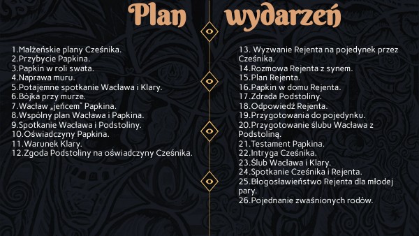 Główne wątki: wątek miłosny, wątek zbrodni i kary, wątek polityczny, wątek baśniowy, wątek obyczajowy