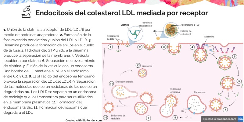 1. Unión de la clatrina al receptor de LDL (LDLR) por medio de proteínas adaptadoras. 2. Formación de la fosa revestida por clatrina y unión del LDL a LDLR. 3. Dinamina produce la formación de anillos en el cuello de la fosa. 4. Hidrolisis del GTP unido a la dinamina produce la separación de la membrana. 5. Vesícula recubierta por clatrina. 6. Separación del revestimiento de clatrina. 7. Fusión de la vesícula con un endosoma. Una bomba de H+ mantiene el pH en el endosoma entre 6,0 y 6,2. 8. El pH ácido del endosoma temprano provoca la separación del LDL del LDLR. 9. Separación de las moléculas que serán recicladas de las que serán degradadas. 10. Los LDLR se separan en un endosoma de reciclaje que los transportara para ser reutilizados en la membrana plasmática. 11. Formación del endosoma tardío. 12. Formación del lisosoma que degradará el LDL.
