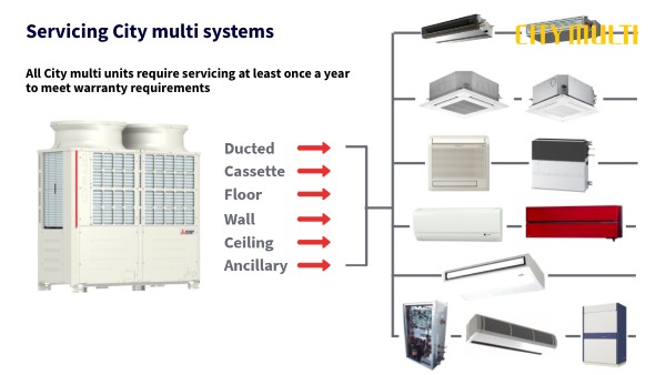 The service frequency of the VRF City multi system needs to be agreed depending on the kind of environment the system is installed