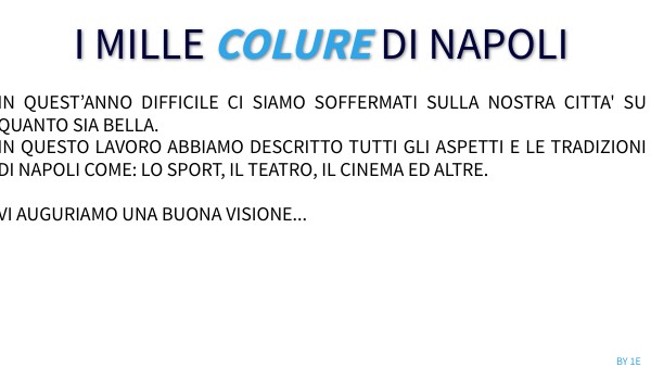 IN QUEST’ANNO DIFFICILE CI SIAMO SOFFERMATI SULLA NOSTRA CITTA' SU QUANTO SIA BELLA. IN QUESTO LAVORO ABBIAMO DESCRITTO TUTTI GLI ASPETTI E LE TRADIZIONI DI NAPOLI COME: LO SPORT, IL TEATRO, IL CINEMA ED ALTRE. VI AUGURIAMO UNA BUONA VISIONE...