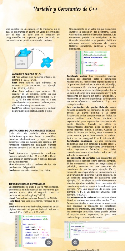 VARIABLES BASICOS DE C++int Para valores tipo números enteros, por ejemplo