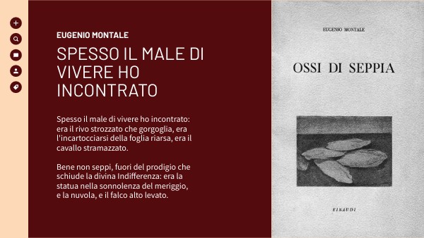 Spesso il male di vivere ho incontrato: era il rivo strozzato che gorgoglia, era l'incartocciarsi della foglia riarsa, era il cavallo stramazzato. Bene non seppi, fuori del prodigio che schiude la divina Indifferenza: era la statua nella sonnolenza del meriggio, e la nuvola, e il falco alto levato.