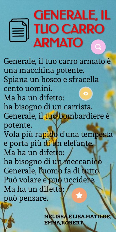 Generale, il tuo carro armato è una macchina potente. Spiana un bosco e sfracella cento uomini. Ma ha un difetto: ha bisogno di un carrista. Generale, il tuo bombardiere è potente. Vola più rapido d'una tempesta e porta più di un elefante. Ma ha un difetto: ha bisogno di un meccanico Generale, l'uomo fa di tutto. Può volare e può uccidere. Ma ha un difetto: può pensare.