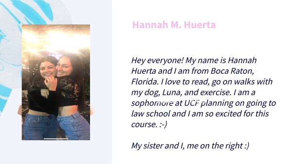 Hey everyone! My name is Hannah Huerta and I am from Boca Raton, Florida. I love to read, go on walks with my dog, Luna, and exercise. I am a sophomore at UCF planning on going to law school and I am so excited for this course. :-) My sister and I, me on the right :)