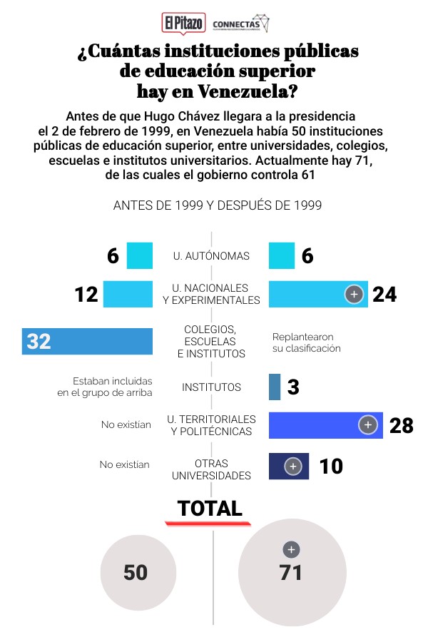 Antes de que Hugo Chávez llegara a la presidencia el 2 de febrero de 1999, en Venezuela había 50 instituciones públicas de educación superior, entre universidades, colegios, escuelas e institutos universitarios. Actualmente hay 71, de las cuales el gobierno controla 61
