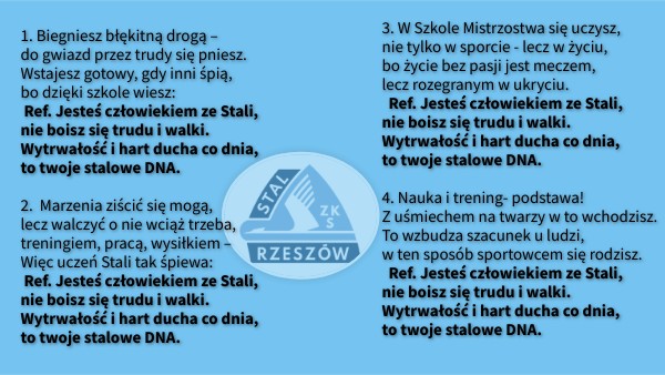 3. W Szkole Mistrzostwa się uczysz, nie tylko w sporcie - lecz w życiu, bo życie bez pasji jest meczem, lecz rozegranym w ukryciu. Ref. Jesteś człowiekiem ze Stali, nie boisz się trudu i walki. Wytrwałość i hart ducha co dnia, to twoje stalowe DNA. 4. Nauka i trening- podstawa! Z uśmiechem na twarzy w to wchodzisz. To wzbudza szacunek u ludzi, w ten sposób sportowcem się rodzisz. Ref. Jesteś człowiekiem ze Stali, nie boisz się trudu i walki. Wytrwałość i hart ducha co dnia, to twoje stalowe DNA.